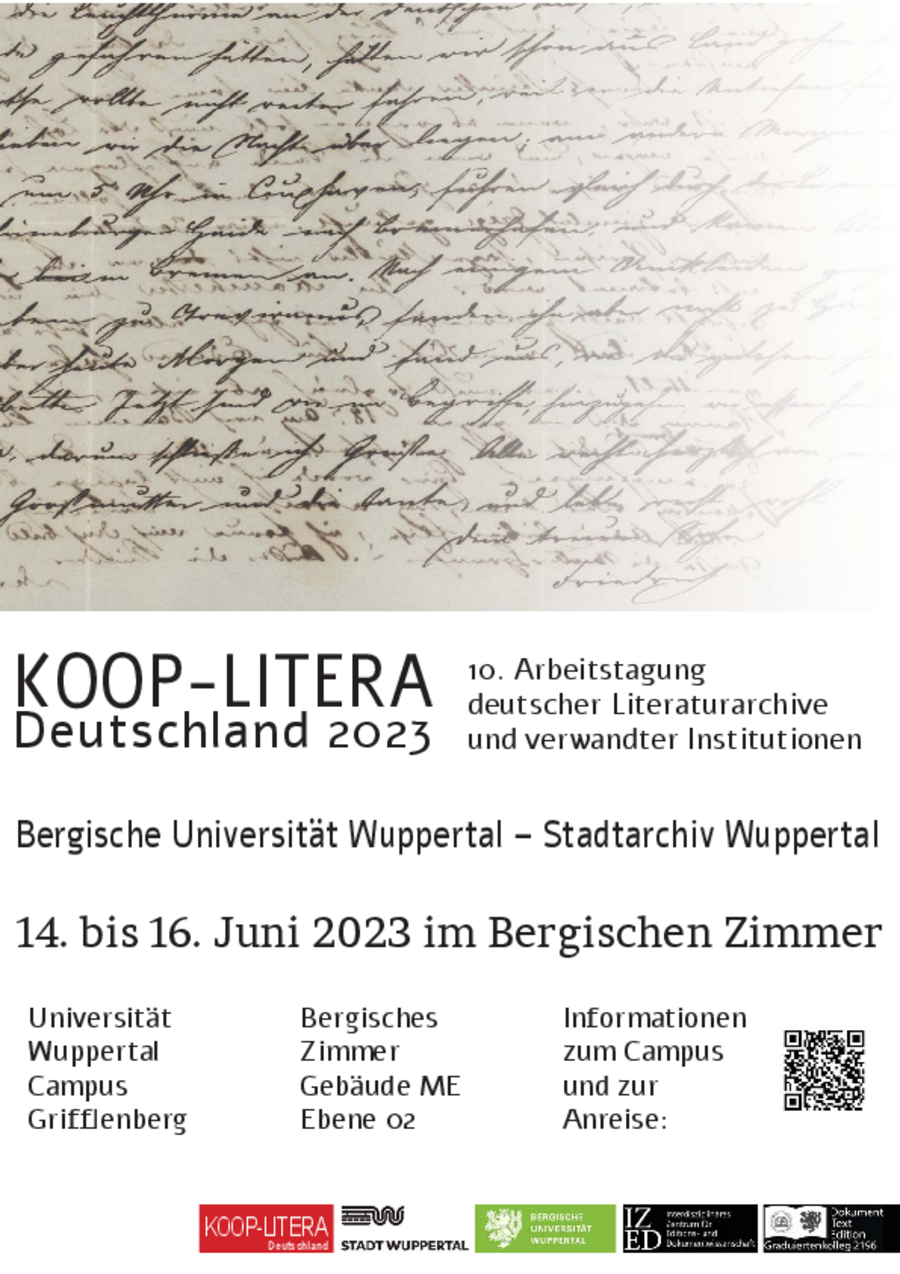 Vom 14.–16. Juni 2023 findet an der Bergischen Universität Wuppertal die 10. Arbeitstagung der deutschen Literaturarchive und verwandter Institutionen statt. Sie wird von der Bergischen Universität (Prof. Dr. Wolfgang Lukas) und dem Stadtarchiv Wuppertal (Thorsten Dette) gemeinsam ausgerichtet. Das „KOOP-LITERA“ ist ein Netzwerk von deutschen, luxemburgischen, österreichischen und schweizerischen Institutionen, die Nachlässe und Autographen erwerben, erschließen, bewahren und der Öffentlichkeit zugänglich machen. Im Fokus der diesjährigen Tagung werden vor allem Fragen der digitalen Erschließung und Edition von Nachlassmaterialien stehen. Einen weiteren Schwerpunkt wird die Diskussion über sowohl medientechnische (u.a. Metasprachen, sog. Anwendungspersistierung) als auch sozial-institutionelle Aspekte der digitalen Langzeitarchivierung bilden.